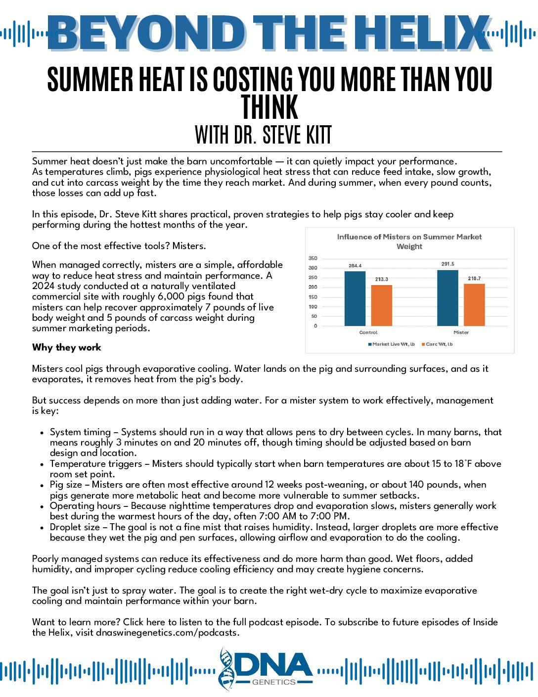 Summer growth suppression in finishing pigs is one of the most persistent and costly seasonal challenges in the pork industry. In this episode, Dr. Steve Kitt discusses how misters in finishers can help producers recover approximately 7 pounds of live bodyweight and 5 pounds of carcass weight during summer marketing periods.